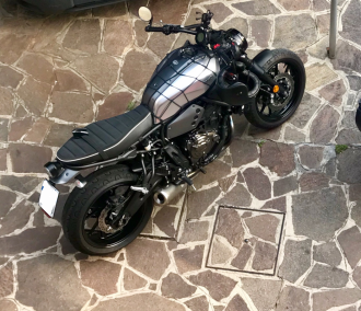 Poi finalmente è arriva la piastra porta faro e relativi accessori: Piastra vetroresina portafaro anteriore S2 Concept - Saute vent Yamaha XSR700 Parafango anteriore nero SW-Motech Supporto smartphone - RAM Mount RAM-B-149Z-UN7U Doppia presa USB sotto sella + relè (impianto sotto chiave) Per qualche mese ho realizzato due supporti per le frecce originali (di pessima qualità), ora li ho fatti realizzare in acciaio. Poi ho montato gli specchietti bar end (economici e di plastica) Specchietti BarEnd omologati Fino ad arrivare allo scarico trovato "d'occasionissima"... Scarico completo Akrapovic MT-07 Euro 4 omologato